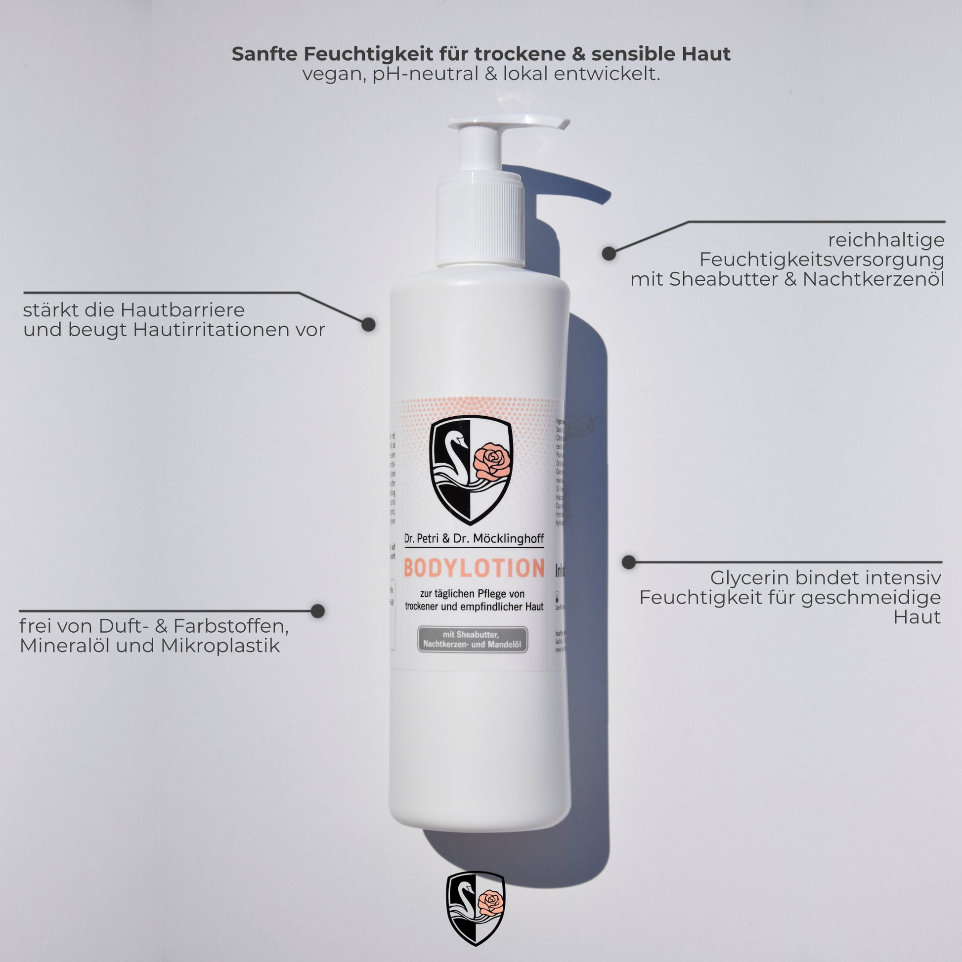 Leichte, schnell einziehende Körperlotion für empfindliche, trockene und gereizte Haut. Versorgt die Haut intensiv mit Feuchtigkeit, stärkt die Hautbarriere und sorgt für ein geschmeidiges, gepflegtes Hautgefühl – ideal für die tägliche Anwendung am ganzen Körper.