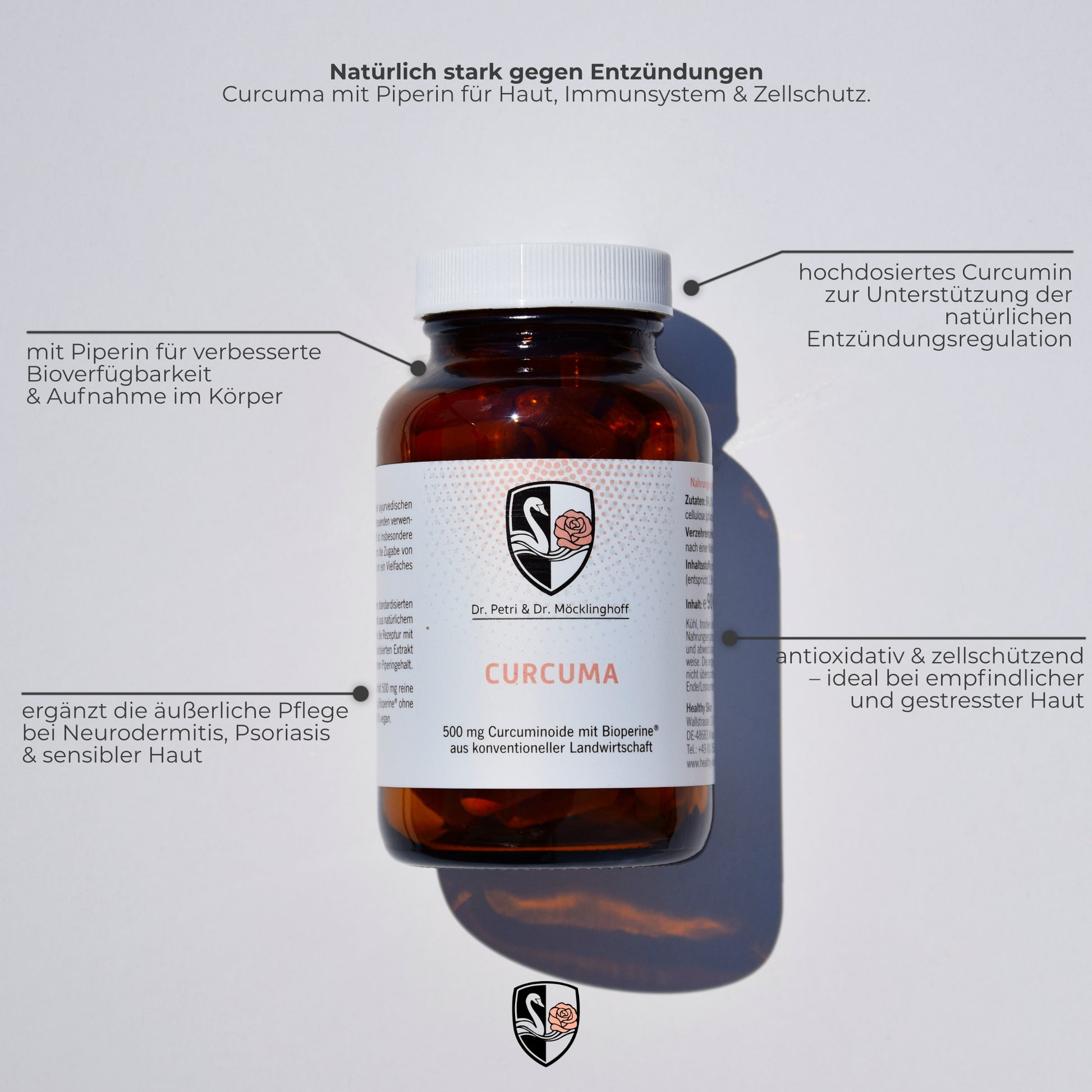 - Curcuma Kapseln: Enthalten hochwertiges Curcumin plus Piperin zur besseren Aufnahme. Curcumin ist bekannt für seine starke pflanzliche Entzündungshemmung und ergänzt die Wirkung der anderen Produkte optimal.