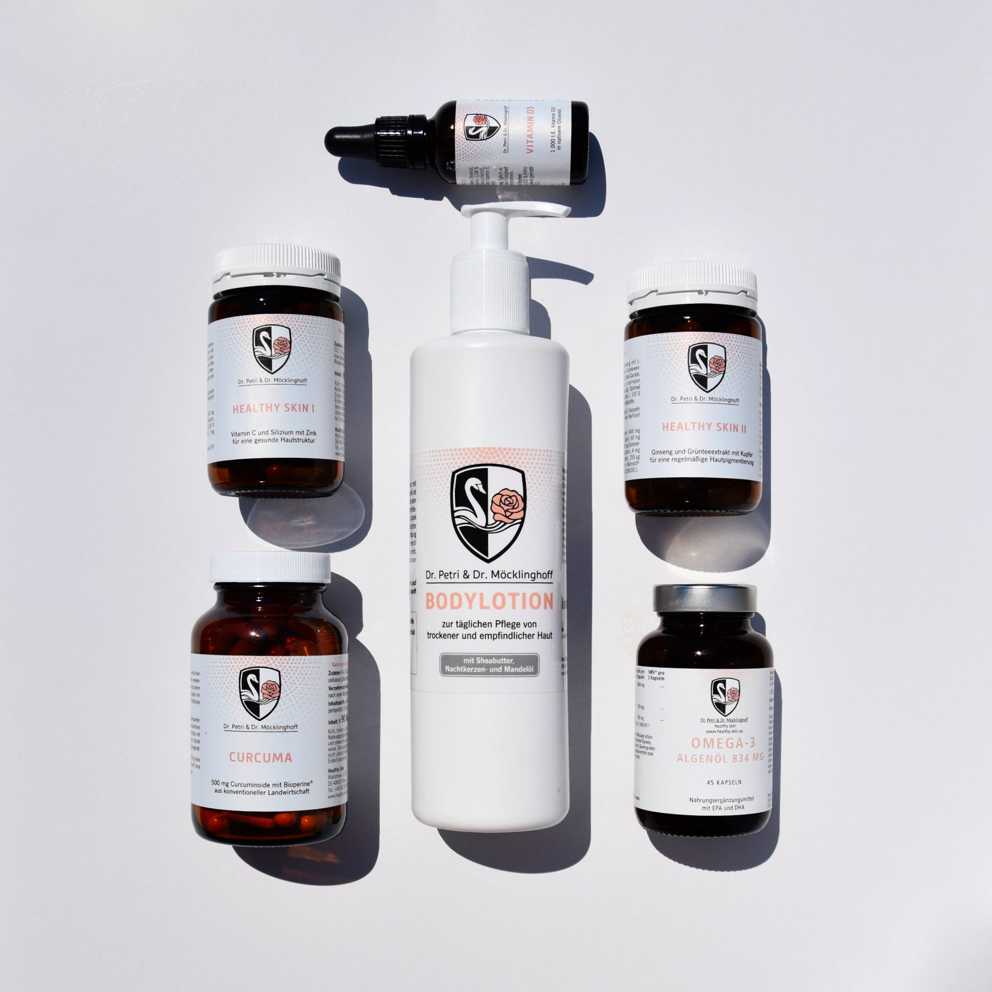 - Healthy Skin I und II: Enthalten eine dermatologisch entwickelte Kombination aus Vitaminen, Spurenelementen und Antioxidantien – zur Unterstützung der Hautregeneration, Reduktion von Entzündungen und Stabilisierung der Hautbarriere.