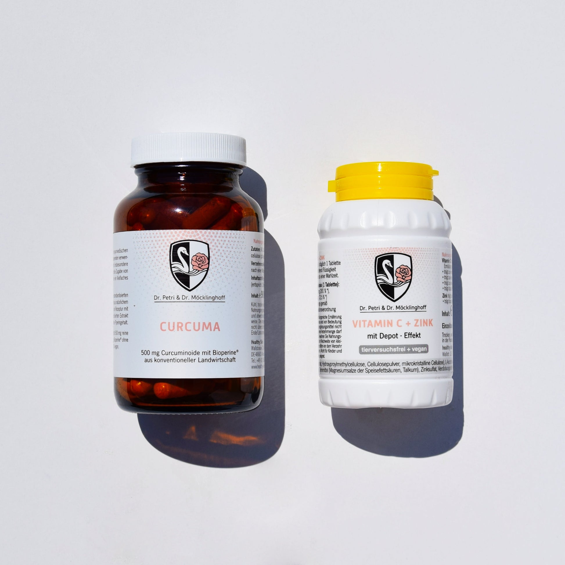 Unser Immunsystem-Set ist ideal, um deine körpereigene Abwehr gezielt zu unterstützen – das ganze Jahr über. Mit einer intelligenten Kombination aus hochdosiertem Vitamin C + Zink und hochwertigem Curcuma. Alle Produkte sind 100 % vegan, gut verträglich und frei von unnötigen Zusätzen. Jetzt inklusive nachhaltiger Baumwolltragetasche gratis.